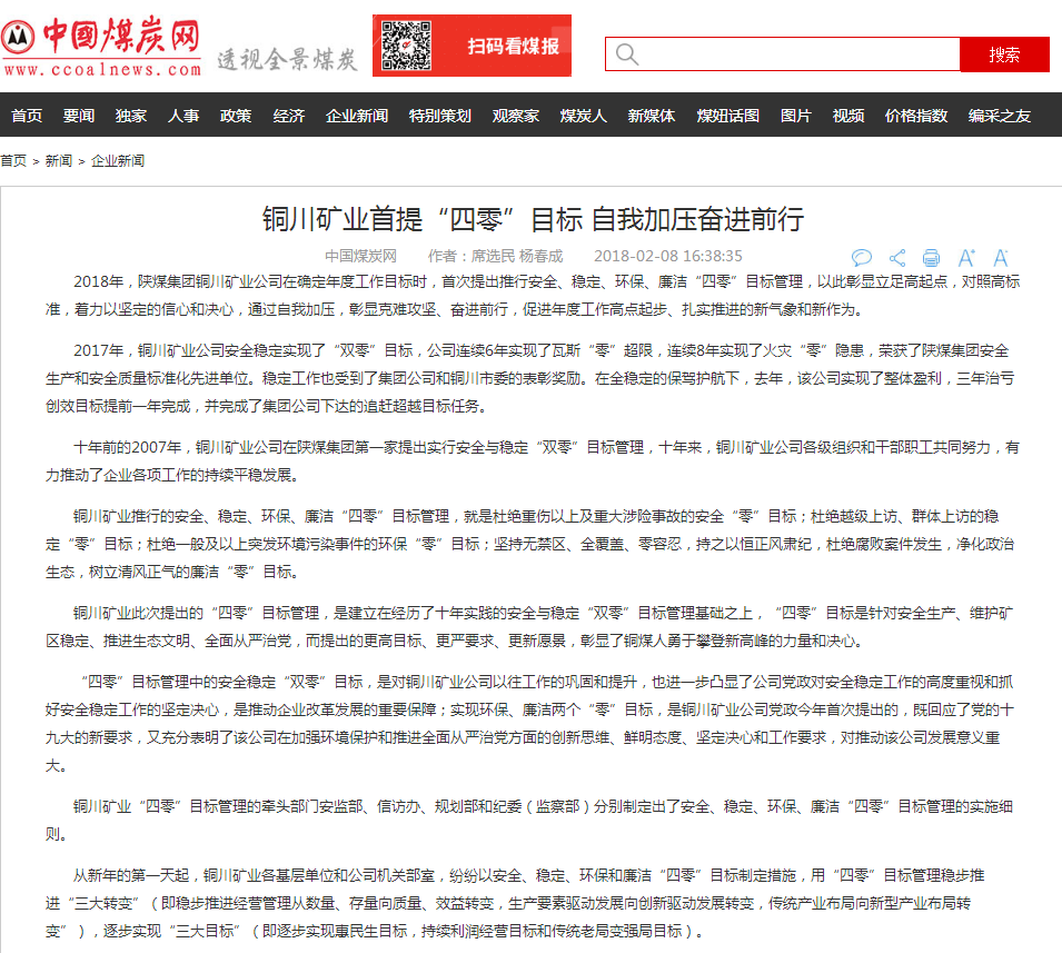銅川礦業(yè)此次提出的“四零”目標管理,是建立在經(jīng)歷了十年實踐的安全與穩(wěn)定“雙零”目標管理基礎(chǔ)之上,“四零”目標是針對安全生產(chǎn)、維護礦區(qū)穩(wěn)定、推進生態(tài)文明、全面從嚴治黨,而提出的更高目標、更嚴要求、更新愿景,彰顯了銅煤人勇于攀登新高峰的力量和決心。