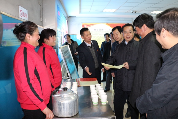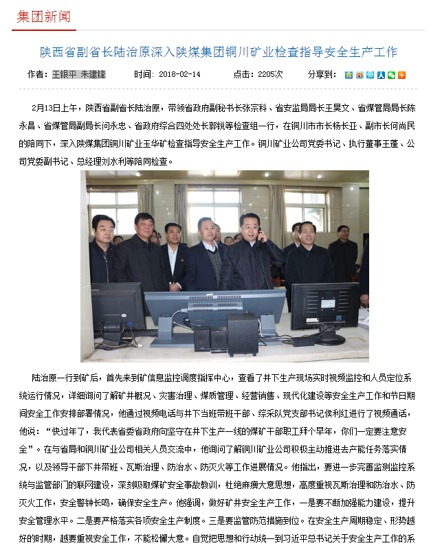 陸治原一行到礦后,首先來到礦信息監(jiān)控調(diào)度指揮中心,查看了井下生產(chǎn)現(xiàn)場實時視頻監(jiān)控和人員定位系統(tǒng)運行情況,詳細詢問了解礦井概況、災害治理、煤質(zhì)管理、經(jīng)營銷售、現(xiàn)代化建設(shè)等安全生產(chǎn)工作和節(jié)日期間安全工作安排部署情況,他通過視頻電話與井下當班帶班干部、綜采隊黨支部書記侯利紅進行了視頻通話,他說:“快過年了,我代表省委省政府向堅守在井下生產(chǎn)一線的煤礦干部職工拜個早年,你們一定要注意安全”。在與省局和銅川礦業(yè)公司相關(guān)人員交流中,他詢問了解銅川礦業(yè)公司積極主動推進去產(chǎn)能任務落實情況,以及領(lǐng)導干部下井帶班、瓦斯治理、防治水、防滅火等工作進展情況。他指出,要進一步完善監(jiān)測監(jiān)控系統(tǒng)與監(jiān)管部門的聯(lián)網(wǎng)建設(shè),深刻吸取煤礦安全事故教訓,杜絕麻痹大意思想,高度重視瓦斯治理和防治水、防滅火工作,安全警鐘長鳴,確保安全生產(chǎn)。他強調(diào),做好礦井安全生產(chǎn)工作,一是要不斷加強能力建設(shè),提升安全管理水平。二是要嚴格落實各項安全生產(chǎn)制度。三是要監(jiān)管防范措施到位。在安全生產(chǎn)周期穩(wěn)定、形勢越好的時期,越要重視安全工作,不能松懈大意。自覺把思想和行動統(tǒng)一到習近平總書記關(guān)于安全生產(chǎn)工作的系列重要講話和指示精神上來,將“人命關(guān)天,發(fā)展決不能以犧牲人的生命為代價”作為一條不可逾越的紅線,始終堅持“綠色GDP”發(fā)展理念,認真貫徹落實省委省政府安全生產(chǎn)工作要求,健全完善安全生產(chǎn)責任制,領(lǐng)導干部切實擔負起安全生產(chǎn)具體責任,齊心協(xié)力保障銅煤安全生產(chǎn)。要堅決貫徹落實供給側(cè)結(jié)構(gòu)性改革,按照省委省政府要求推動去產(chǎn)能工作,達不到安全等相關(guān)要求的礦井及時關(guān)閉,做好人員安置工作。同時,深挖內(nèi)部潛力,做好產(chǎn)業(yè)結(jié)構(gòu)調(diào)整,充分釋放優(yōu)質(zhì)產(chǎn)能。