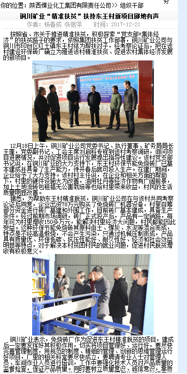 按照省、市關(guān)于推進(jìn)精準(zhǔn)扶貧,積極探索“黨支部+集體經(jīng)濟”的扶貧路子的要求,依照集團扶貧工作部署,銅川礦業(yè)公司與銅川市印臺區(qū)紅土鎮(zhèn)東王村結(jié)為幫扶對子,經(jīng)考察論證后,把在該村建設(shè)環(huán)保磚廠確立為推進(jìn)該村精準(zhǔn)扶貧、促進(jìn)農(nóng)村集體經(jīng)濟發(fā)展的新項目。
