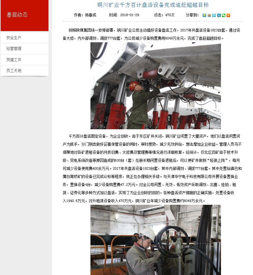 按照陜煤集團統(tǒng)一安排部署,銅川礦業(yè)公司主動搞好設(shè)備盤活工作,2017年共盤活設(shè)備1823臺套,通過設(shè)備大修,內(nèi)外部調(diào)劑、調(diào)撥777臺套,為公司減少設(shè)備購置費用6049萬余元,完成了追趕超越目標。