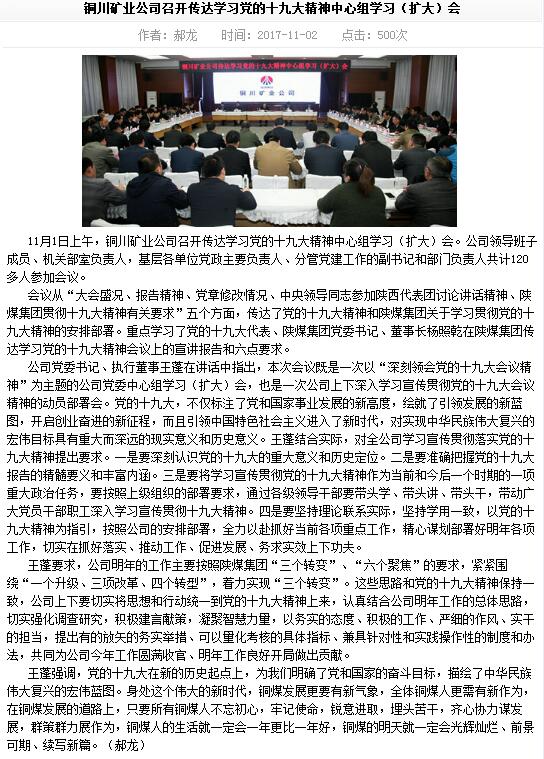 11月1日上午,銅川礦業(yè)公司召開傳達學習黨的十九大精神中心組學習(擴大)會。公司領導班子成員、機關部室負責人,基層各單位黨政主要負責人、分管黨建工作的副書記和部門負責人共計120多人參加會議。