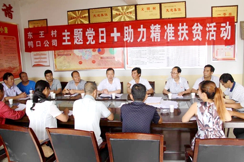 近日,鴨口公司召開(kāi)黨委會(huì)專(zhuān)題安排部署“主題黨日+助力精準(zhǔn)扶貧”活動(dòng)。在組織全體黨員干部為扶貧對(duì)象捐款的基礎(chǔ)上,該公司領(lǐng)導(dǎo)班子和黨群部門(mén)工作人員高舉黨旗、佩戴黨徽,到東王村開(kāi)展精準(zhǔn)扶貧入戶(hù)調(diào)研工作,并為村黨支部捐贈(zèng)了慰問(wèn)金。