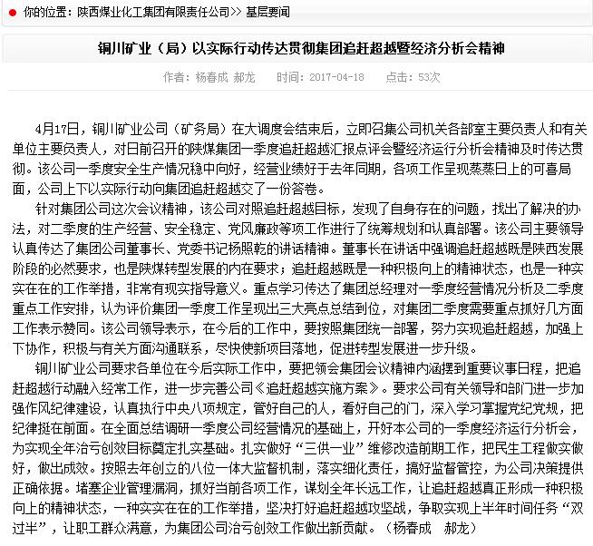 銅川礦業(yè)公司要求各單位在今后實際工作中,要把領會集團會議精神內涵擺到重要議事日程,把追趕超越行動融入經(jīng)常工作,進一步完善公司《追趕超越實施方案》。要求公司有關領導和部門進一步加強作風紀律建設,認真執(zhí)行中央八項規(guī)定,管好自己的人,看好自己的門,深入學習掌握黨紀黨規(guī),把紀律挺在前面。在全面總結調研一季度公司經(jīng)營情況的基礎上,開好本公司的一季度經(jīng)濟運行分析會,為實現(xiàn)全年治虧創(chuàng)效目標奠定扎實基礎。扎實做好“三供一業(yè)”維修改造前期工作,把民生工程做實做好,做出成效。按照去年創(chuàng)立的八位一體大監(jiān)督機制,落實細化責任,搞好監(jiān)督管控,為公司決策提供正確依據(jù)。堵塞企業(yè)管理漏洞,抓好當前各項工作,謀劃全年長遠工作,讓追趕超越真正形成一種積極向上的精神狀態(tài),一種實實在在的工作舉措,堅決打好追趕超越攻堅戰(zhàn),爭取實現(xiàn)上半年時間任務“雙過半”,讓職工群眾滿意,為集團公司治虧創(chuàng)效工作做出新貢獻。