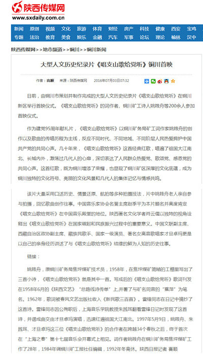 陜西傳媒網(wǎng):大型人文歷史紀(jì)錄片《唱支山歌給黨聽》銅川首映