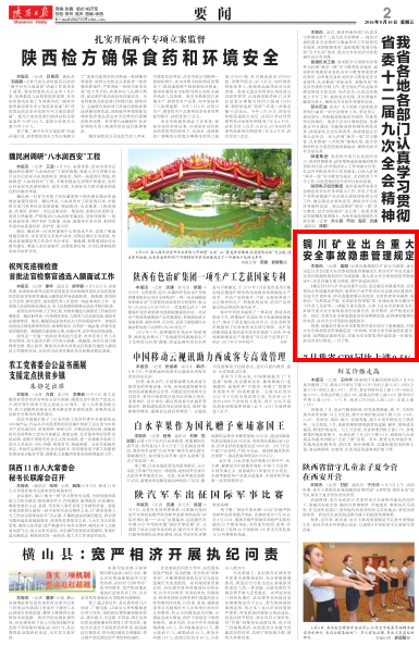 陜西日?qǐng)?bào):銅川礦業(yè)出臺(tái)重大安全事故隱患管理規(guī)定