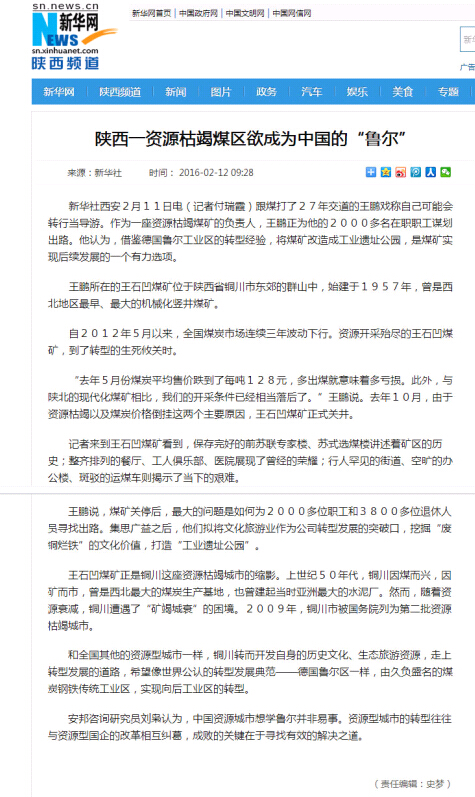 新華社西安2月11日電(記者付瑞霞)跟煤打了27年交道的王鵬戲稱自己可能會(huì)轉(zhuǎn)行當(dāng)導(dǎo)游。作為一座資源枯竭煤礦的負(fù)責(zé)人,王鵬正為他的2000多名在職職工謀劃出路。他認(rèn)為,借鑒德國(guó)魯爾工業(yè)區(qū)的轉(zhuǎn)型經(jīng)驗(yàn),將煤礦改造成工業(yè)遺址公園,是煤礦實(shí)現(xiàn)后續(xù)發(fā)展的一個(gè)有力選項(xiàng)。