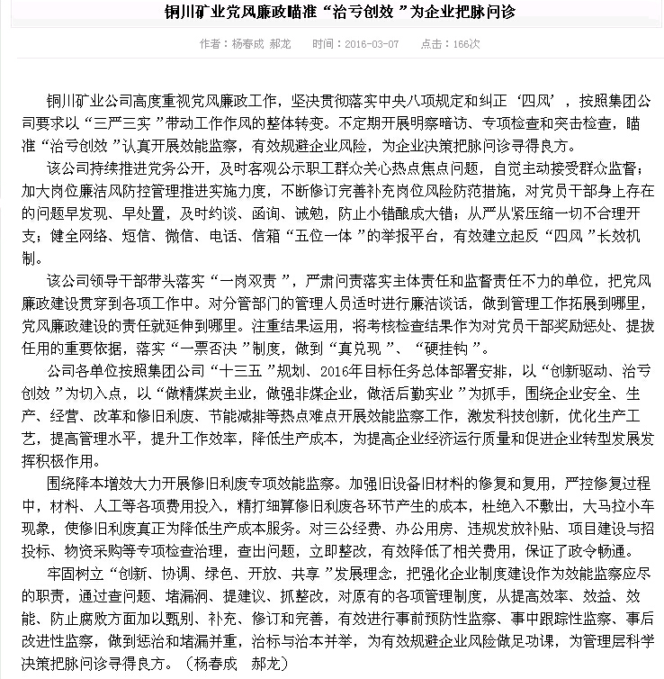 銅川礦業(yè)公司高度重視黨風廉政工作,堅決貫徹落實中央八項規(guī)定和糾正‘四風’,按照集團公司要求以“三嚴三實”帶動工作作風的整體轉(zhuǎn)變。不定期開展明察暗訪、專項檢查和突擊檢查,瞄準“治虧創(chuàng)效”認真開展效能監(jiān)察,有效規(guī)避企業(yè)風險,為企業(yè)決策把脈問診尋得良方。
