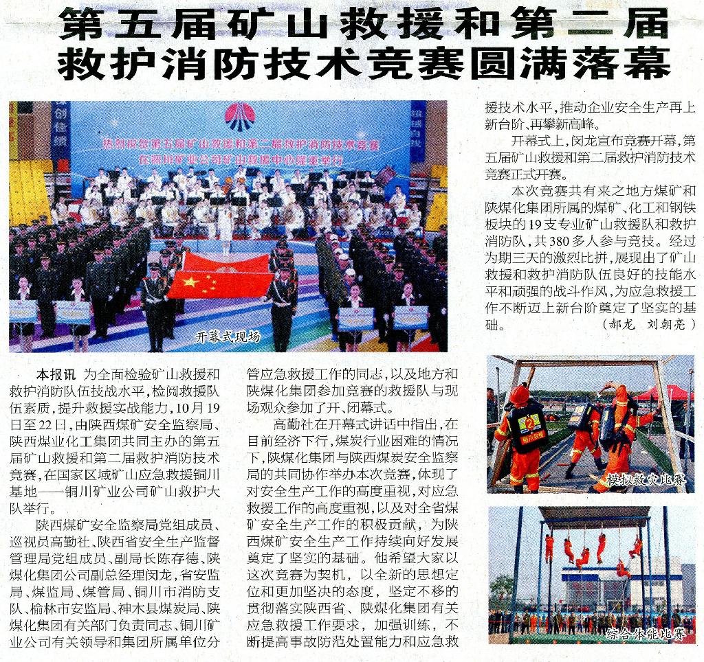 ★10月27日“陜西工人報”刊發(fā)《第五屆礦山救援和第二屆救護消防技術競賽圓滿落幕》(作者:郝龍 劉朝亮)