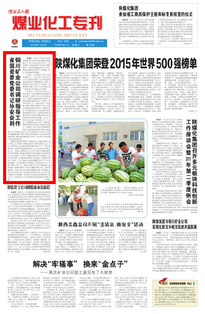 7月21日,陜西省國(guó)資委黨委書記孫安會(huì)來(lái)到陜煤化集團(tuán)銅川礦業(yè)公司就企業(yè)安全生產(chǎn)、經(jīng)營(yíng)管理、改革發(fā)展等工作進(jìn)行調(diào)研指導(dǎo)。省國(guó)資委副巡視員杜芳軍,陜煤化集團(tuán)總經(jīng)理嚴(yán)廣勞及銅川礦業(yè)公司領(lǐng)導(dǎo)陪同調(diào)研。
