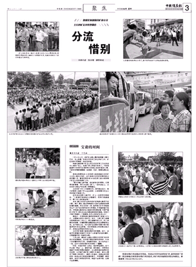 | 分流的工人在礦區(qū)廣場上合影留念。三歲的小女孩找到排隊照相的父親,不舍得離開。
