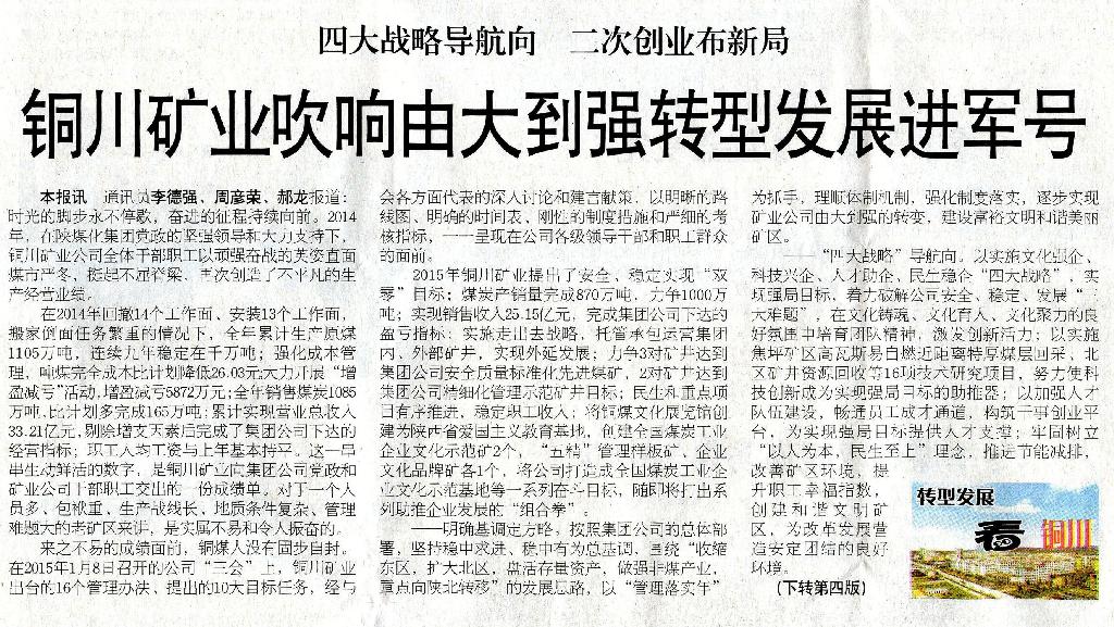 1月18日“銅川日?qǐng)?bào)”頭版頭條刊發(fā)《銅川礦業(yè)吹響由大到強(qiáng)轉(zhuǎn)型發(fā)展進(jìn)軍號(hào)》(作者:李德強(qiáng) 周彥榮 郝龍)