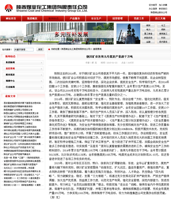 ★ 1月23日“陜煤化集團(tuán)網(wǎng)站”刊發(fā)《銅川礦業(yè)連續(xù)九年煤炭產(chǎn)量超千萬(wàn)噸》(作者:郝龍)