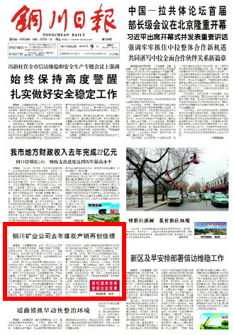 2014年,銅川礦業(yè)公司全年累計掘進56138米,比計劃多完成1138米。開展技術(shù)攻關(guān),完成科研項目6項,推廣新技術(shù)13項。同時,科學合理組織煤炭生產(chǎn),安全撤回14個工作面,安裝13個工作面,做到了搬家倒面不停產(chǎn),確保了生產(chǎn)任務的完成;在經(jīng)營管理方面,嚴格成本管理,大力開展“增盈減虧”活動,盤活庫存資金,成立了機電設備維修中心,降低了維修費用;同時,深化改革和重組工作,并不斷開展內(nèi)部板塊間的合作,提出了“大格局”理念,公司與西安重裝集團簽訂了戰(zhàn)略合作協(xié)議,和陜西煤層氣公司達成了合作意向,和生態(tài)水泥、建設集團達成合作協(xié)議,實現(xiàn)了兄弟板塊抱團取暖、共度難關(guān)、共同發(fā)展、合作共贏的局面;重點工程進展順利,建成了國家礦山救援銅川區(qū)域基地;完成了玉華礦后溝風井、東坡礦運輸系統(tǒng)改造方案和PVC項目竣工驗收前的各項準備工作;下石節(jié)礦2#副斜井已施工2013米;公司信息化、數(shù)字化大樓等工程進展有序。
