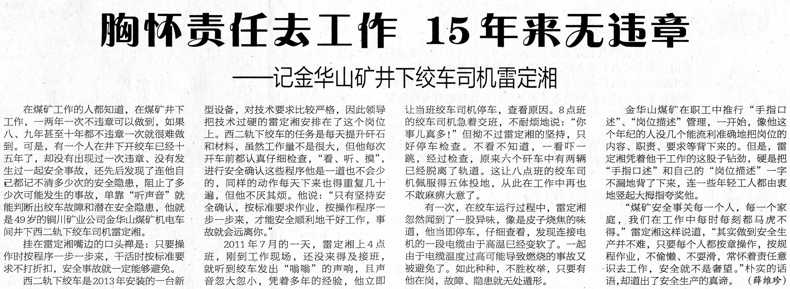 ★ 8月19日“陜西工人報(bào)”刊發(fā)《胸懷責(zé)任去工作15年來無違章——記金華山礦井下絞車司機(jī)雷定湘》(作者:薛維珍)