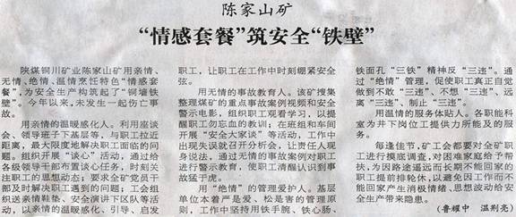 ★ 6月9日“陜西日報”刊發(fā)《陳家山礦用“情感套餐”構筑安全“銅墻鐵壁”》(作者:喜順)