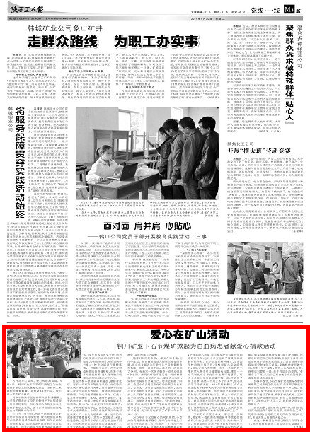 五月花開紅似火,愛心傳遞涌真情。5月8日,銅川礦業(yè)下石節(jié)煤礦掀起了為白血病孩子張卓文捐款獻(xiàn)愛心活動,全礦職工家屬紛紛慷慨解囊,共捐款5.8余萬元。愛心再一次在礦山涌動。