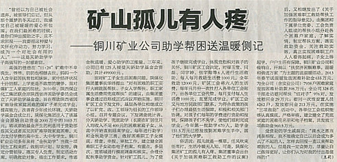 ★1月21日“陜西工人報(bào)”刊發(fā)《礦山孤兒有人疼——銅川礦業(yè)公司助學(xué)幫困送溫暖側(cè)記》(作者:王莉)