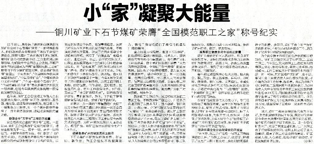 ★ 12月24日“陜西工人報(bào)”刊發(fā)《小“家”凝聚大能量—銅川礦業(yè)下石節(jié)煤礦榮膺“全國(guó)模范之家” 稱號(hào)紀(jì)實(shí)》(作者:張萍)