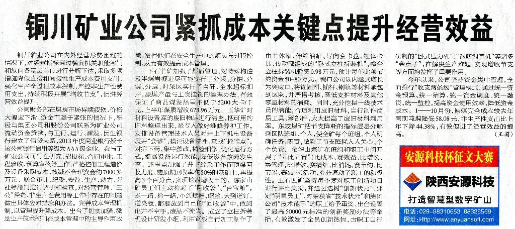 ★ 12月17日“陜西工人報(bào)”刊發(fā)《銅川礦業(yè)公司緊抓成本關(guān)鍵點(diǎn)提升經(jīng)營(yíng)效益》(作者:王莉)