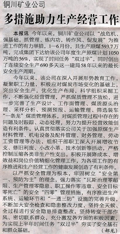 ★ 8月27日“陜西工人報”刊發(fā)《銅川礦業(yè)公司多措施助力生產(chǎn)經(jīng)營工作》(作者:郝龍)
