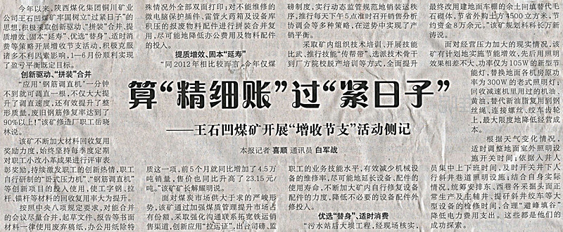 ★ 8月19日“陜西日報”刊發(fā)《算“精細(xì)帳”過“緊日子”——王石凹煤礦開展增收節(jié)支活動側(cè)記》(作者:喜順 白軍戰(zhàn))