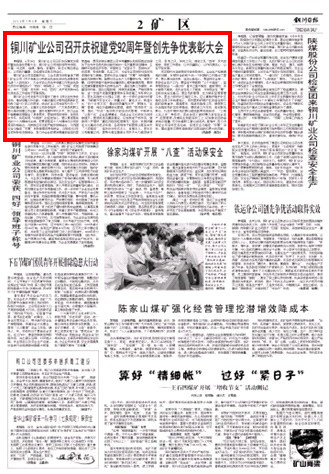 6月26日,銅川礦業(yè)公司召開慶祝建黨92周年暨創(chuàng)先爭(zhēng)優(yōu)表彰大會(huì)。銅川礦業(yè)公司黨政領(lǐng)導(dǎo)宋志剛、王蓬、劉啟科、徐捷、薛鳴、封建利、張志文等出席會(huì)議,公司執(zhí)行董事、總經(jīng)理宋志剛主持會(huì)議。