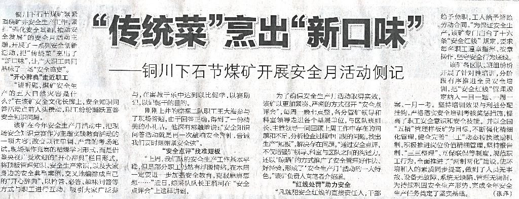 ★ 6月18日“陜西工人報”刊發(fā)《“傳統(tǒng)菜”烹出“新口味” --銅川下石節(jié)煤礦開展安全月活動側(cè)記 》(作者:張萍)