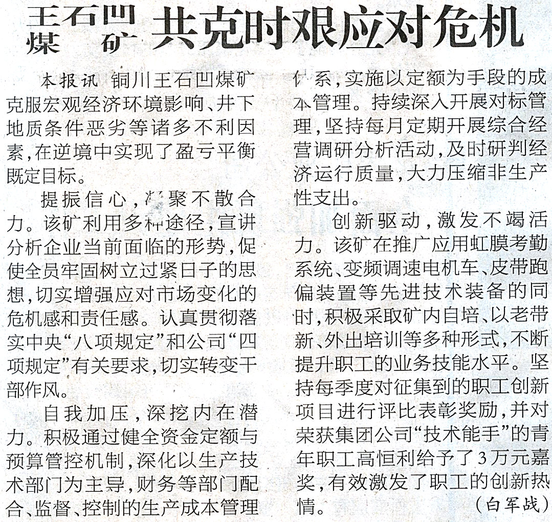 ●6月18日“陜西工人報”煤業(yè)二版刊發(fā)《王石凹煤礦共克時艱應(yīng)對危機 》