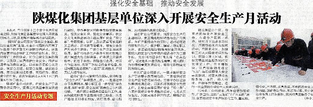 ★ 6月4日“陜西工人報”刊發(fā)《陜煤化集團基層單位深入開展安全生產(chǎn)月活動》(作者:集團綜合報道)