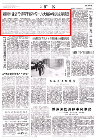 銅川日報 2013年4月24日 第二版 本報訊4月21日,銅川礦業(yè)公司以公司180名副處級領(lǐng)導干部為培訓對象的公司領(lǐng)導干部學習十八精神三期培訓工作圓滿結(jié)束。該公司舉辦本次領(lǐng)導干部培訓班,旨在促進領(lǐng)導干部進一步系統(tǒng)深入地全面把握、深刻理解十八大精神,努力在科學理論的指導下為實現(xiàn)年初公司“三會”確定的各項目標任務(wù),創(chuàng)建富裕文明和諧美麗礦區(qū)提供有力的思想引領(lǐng)、強勁的精神動力和堅強的組織保證,同時也對更新干部思想觀念、優(yōu)化干部知識結(jié)構(gòu)、拓寬干部眼界視野,提升干部境界修養(yǎng),引導領(lǐng)導干部正確把握企業(yè)改革發(fā)展穩(wěn)定大局,理性應(yīng)對當前煤炭市場形勢,積極化解企業(yè)發(fā)展面臨的困難與問題,努力開創(chuàng)各項工作發(fā)展新局面具有重大作用。
