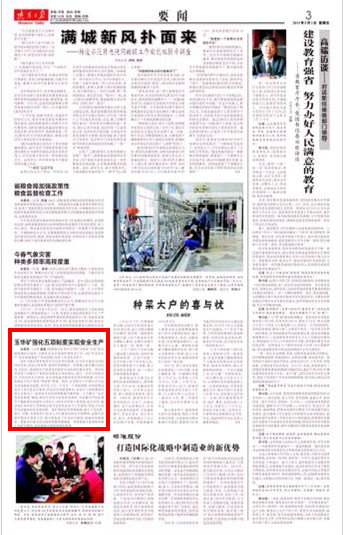 本報(bào)訊陜煤銅川礦務(wù)局玉華礦以強(qiáng)化“五項(xiàng)”安全制度建設(shè)為途徑,不斷夯實(shí)安全基礎(chǔ)管理各項(xiàng)工作,為礦井安全生產(chǎn)、安全發(fā)展奠定了堅(jiān)實(shí)基礎(chǔ),實(shí)現(xiàn)了首季安全生產(chǎn)。