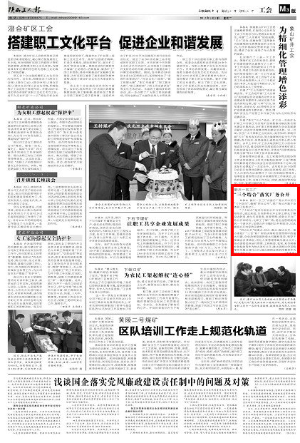 陜西工人報(bào) 2013年元月8日 煤業(yè)三版 銅川一五三廠在推行廠務(wù)公開(kāi)中實(shí)行“三個(gè)結(jié)合”,確保“四點(diǎn)公開(kāi)”,把廠務(wù)公開(kāi)置于全體職工監(jiān)督之下。“三個(gè)結(jié)合”是實(shí)行班組公開(kāi)與車間事務(wù)公開(kāi)相結(jié)合,通過(guò)班組、車間事務(wù)公開(kāi)讓職工群眾了解身邊的事,參與車間事務(wù)、班務(wù)管理;黨務(wù)公開(kāi)與廠務(wù)公開(kāi)相結(jié)合,讓職工了解廠情,把企業(yè)管理提高到一個(gè)新水平;定期公開(kāi)與隨時(shí)公開(kāi)相結(jié)合,以此提高公開(kāi)內(nèi)容的實(shí)效性。