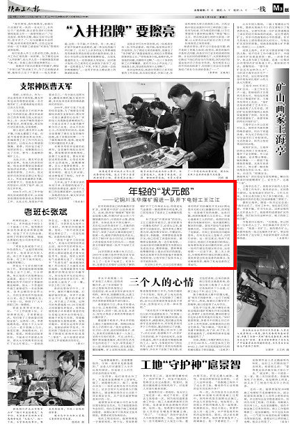 初冬的瑞雪雖已悄然飄落百里礦區(qū),但寒意中的礦山卻熱鬧非凡。此刻,陜西省“銅煤杯”煤礦職業(yè)技能大賽,在銅川礦業(yè)公司三個賽場激烈進行,可謂高手云集、群英薈萃。在如此高水平的比賽中,一名年僅24歲的青年礦工,在激烈的競技中脫穎而出,成為大賽的“一匹黑馬”,榮獲了此次大賽采掘電鉗工組第一名,被授予陜西省技術(shù)狀元,首開了銅川礦業(yè)公司歷史上年齡最小的省級技術(shù)狀元的先河——他就是玉華煤礦掘進一隊井下電鉗工王江江。24歲的陜北米脂小伙王江江,2009年從銅川技師學(xué)院綜采專業(yè)畢業(yè)后,分配到玉華煤礦綜掘一隊,當上了一名井下電鉗工。初來乍到,覺著自己對煤礦已經(jīng)很了解的他,深深感到在學(xué)校學(xué)習(xí)的東西,與煤礦井下工作相差太遠,特別是電氣設(shè)備的一般故障辨識和處理,自己甚至鬧出了很多讓工友捧腹的笑話。