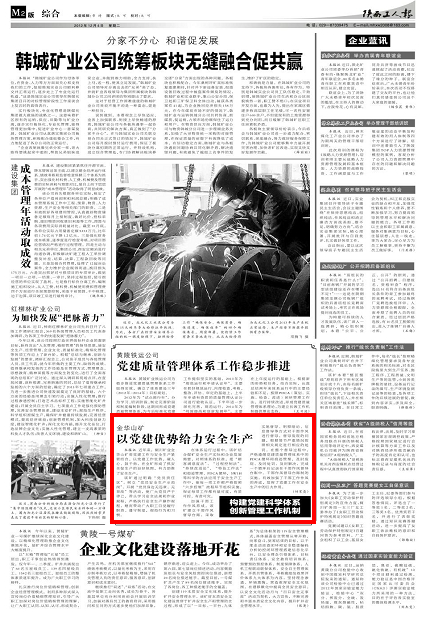 近年來,銅川礦業(yè)金華山礦將黨建工作與安全生產(chǎn)緊密結合,以黨建工作優(yōu)勢,凝人心、鼓干勁,在全礦形成了抓安全促生產(chǎn)的良好氛圍,有力助推了安全生產(chǎn)。