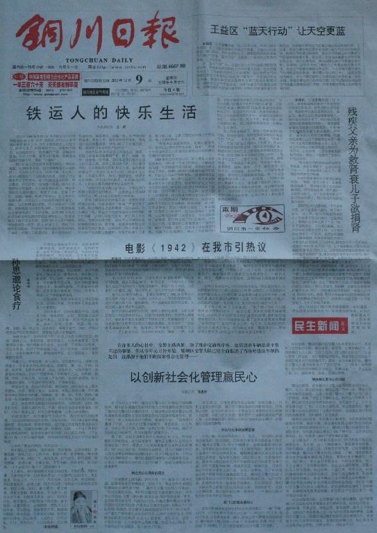 銅川日報 2012年12月9日 頭版頭條