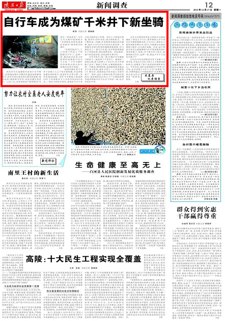 沐浴在冬日溫暖陽光里的下石節(jié)煤礦,雖然地處銅川市耀州區(qū)偏遠(yuǎn)的瑤曲溝壑中,但礦區(qū)卻呈現(xiàn)出荒山都市的景象,地面潔凈,建筑整齊有序,到處充滿生機活力。12月7日,記者來到這個曾榮獲過“全國五一勞動獎狀”、今年七月又被中組部授予“全國創(chuàng)先爭優(yōu)先進基層黨組織”榮譽稱號的煤礦。“在我們的井下,工人們到工作面上下班能騎自行車了,這樣一來,他們每天往來工作面的時間就能節(jié)約半個小時?!毕率?jié)煤礦宣傳部部長邢正科興奮地向記者介紹道。