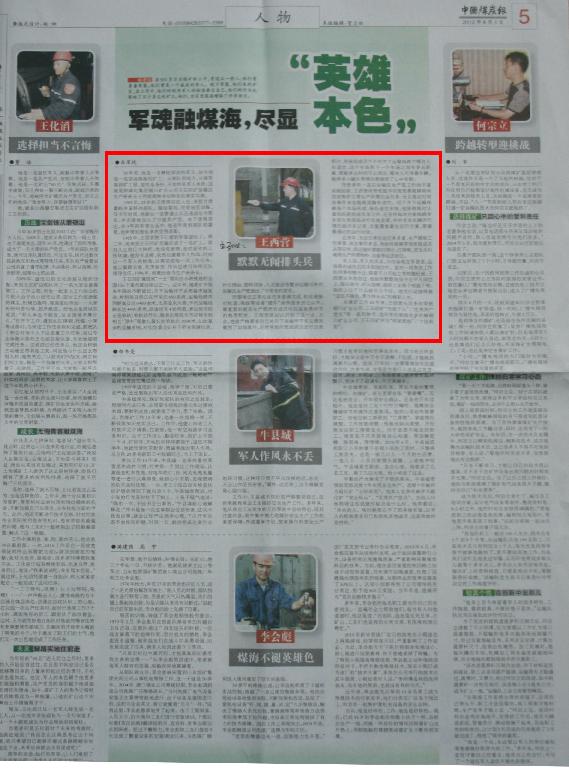 有人說:軍人的風(fēng)采,不僅體現(xiàn)在軍營里,還體現(xiàn)在退伍后的本職崗位中。面對一同參加工作的同事相繼升遷,眼看不少后起之秀相繼趕超,王西營從未有過消極抱怨,始終默默地堅守在平凡崗位上,服從命令聽從指揮,組織安排干啥就干啥,讓干什么就盡力干好,26年煤海歷程中,他曾先后多次榮獲礦業(yè)公司、礦“先進(jìn)個人”、“優(yōu)秀共產(chǎn)黨員”等一系列榮譽(yù)稱號,所帶班組也曾多次被礦業(yè)公司、礦樹評為“明星班組”、“十佳班組”殊榮,書寫了一曲曲“退伍不褪色、勇當(dāng)排頭兵”的精彩傳奇!