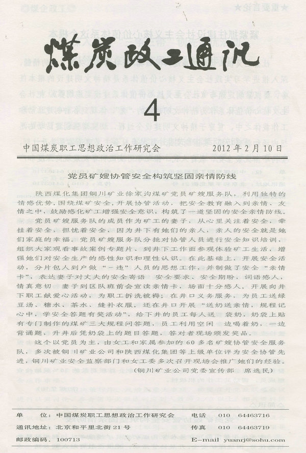 這個以黨員為主,由女工和家屬參加的60多名礦嫂的安全協(xié)管先進,銅川礦業(yè)公司安全監(jiān)察部門和女工委多次召開現(xiàn)場會推廣她們的經(jīng)驗。