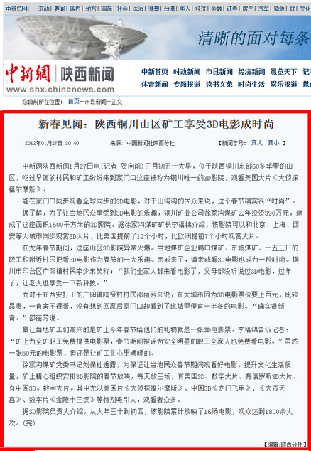 據(jù)了解,為了讓當(dāng)?shù)孛癖娤硎艿?D電影的樂趣,銅川礦業(yè)公司徐家溝煤礦去年投資390萬元,建成了這座面積1500平方米的3D影院。據(jù)徐家溝煤礦礦長(zhǎng)李福錦介紹,該影院可以和北京、上海、西安等大城市同步觀賞3D大片,比美國(guó)提前了12個(gè)小時(shí),比歐洲提前7個(gè)小時(shí)觀賞大片。