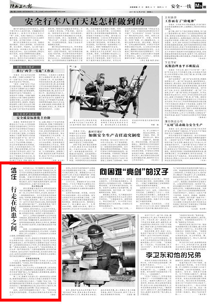 信任是什么?書(shū)中解釋為:相信而敢于托付。在互為“利益共同體”的醫(yī)患之間,信任不僅代表著醫(yī)生較高的專業(yè)素質(zhì)和良好的道德素養(yǎng),更代表著患者的尊重和以命相托的信賴。在銅川礦務(wù)局中心醫(yī)院,有許多醫(yī)患之間互尊互信的和諧畫(huà)面,他們相互鼓勵(lì)相互配合,成為了戰(zhàn)勝疾病的同盟軍,他們用對(duì)彼此的信任,讓愛(ài)行走在醫(yī)患之間。