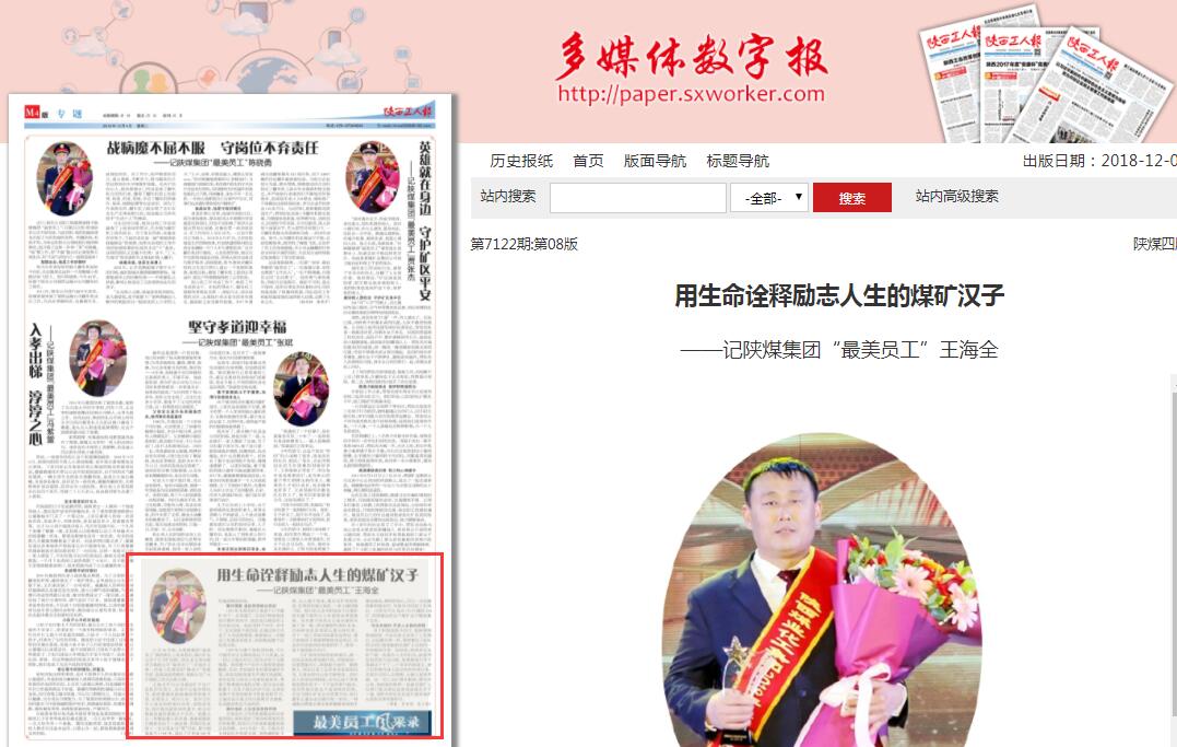 11月20日晚,從陜煤集團(tuán)“最美員工”頒獎典禮上傳來喜訊,銅川礦業(yè)公司下石節(jié)礦綜掘二隊(duì)隊(duì)長王海全被評為集團(tuán)公司“最美員工”(自強(qiáng)自立類),他身上所展現(xiàn)的“煤亮子”堅(jiān)強(qiáng)不屈、奮進(jìn)創(chuàng)業(yè)的精神,得到公司廣大干部職工的關(guān)注和點(diǎn)贊。