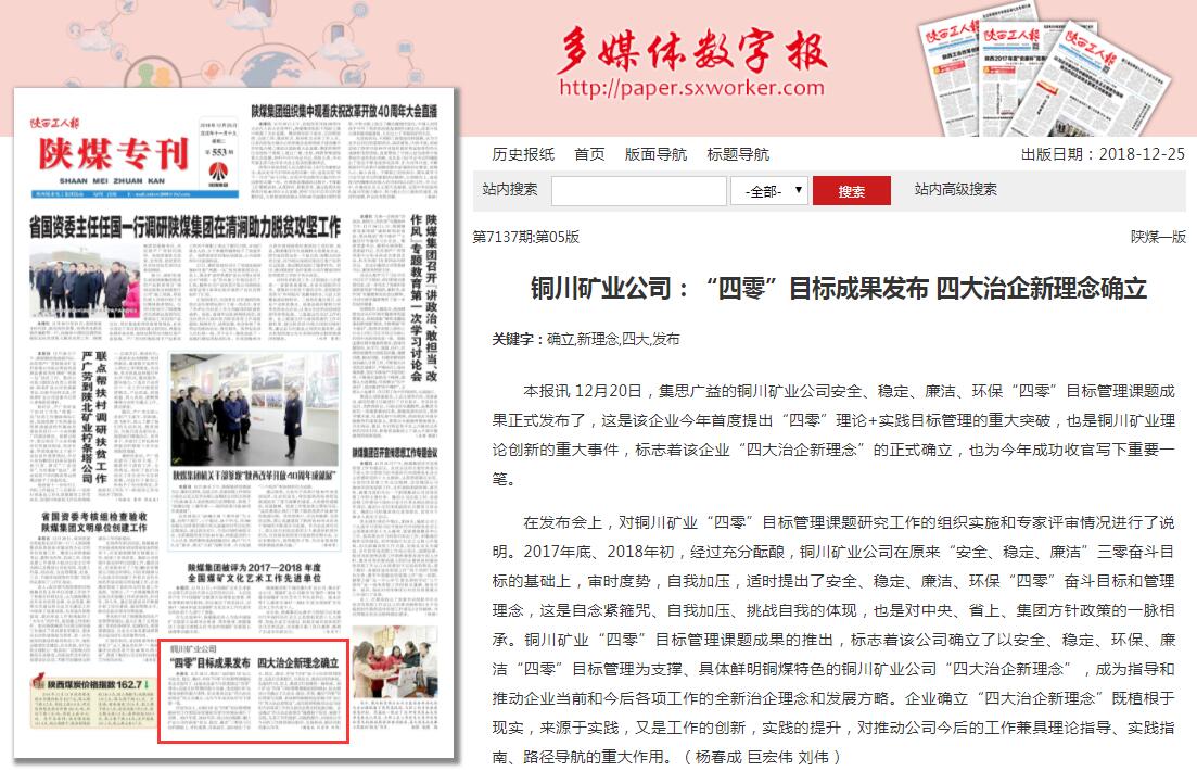 在發(fā)布會上,對銅川礦業(yè)“四零”目標管理課題研究工作的組織實施和專家評審情況進行了說明。2017年底、2018年初,經過充分醞釀,銅川礦業(yè)公司在原來“安全、穩(wěn)定、廉潔”三零奮斗目標的基礎上,審時度勢,自我加壓,適時提出了安全、穩(wěn)定、廉潔、環(huán)保“四零”奮斗目標和管理理念,這是自念緊箍咒、自我加壓、挑戰(zhàn)自我的體現(xiàn),也是對中央、省上、集團方針政策的一脈相承。銅川礦業(yè)“四零”目標管理課題成果的推出,標志著該公司確立了以安全、穩(wěn)定、環(huán)保、廉潔“四零”目標管理為支撐、具體鮮明銅煤特色的銅川礦業(yè)公司“四大治企新理念”,成為指導和推動企業(yè)當前和今后各項工作的全新治企理念和發(fā)展方略。企業(yè)確立“四大治企新理念”既植根于現(xiàn)實,來源于實踐,又是工作的創(chuàng)新,實踐的提升,對推動公司今后的工作兼具理論指導、實踐指南、路徑導航的重大作用。(楊春成 巨宏偉 劉偉)
