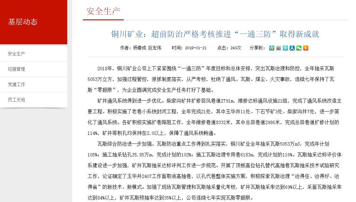 2018年,銅川礦業(yè)公司上下緊緊圍繞“一通三防”年度目標(biāo)和總體安排,突出瓦斯治理和防控,全年抽采瓦斯5053萬立方,加強過程管控,狠抓制度落實,從嚴(yán)考核,杜絕了通風(fēng)、瓦斯、煤塵、火災(zāi)事故,連續(xù)七年保持了瓦斯“零超限”,為企業(yè)圓滿完成安全生產(chǎn)任務(wù)打好了基礎(chǔ)。