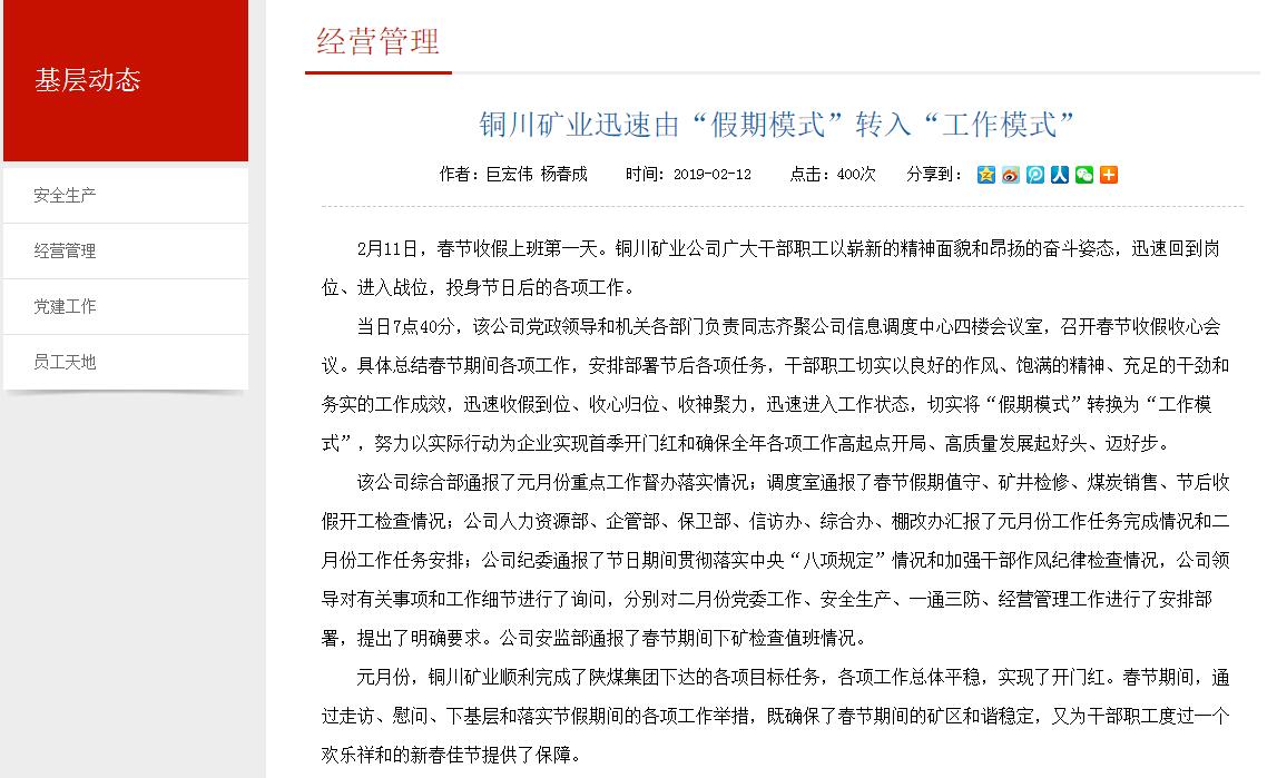 銅川礦業(yè)迅速由“假期模式”轉(zhuǎn)入“工作模式”