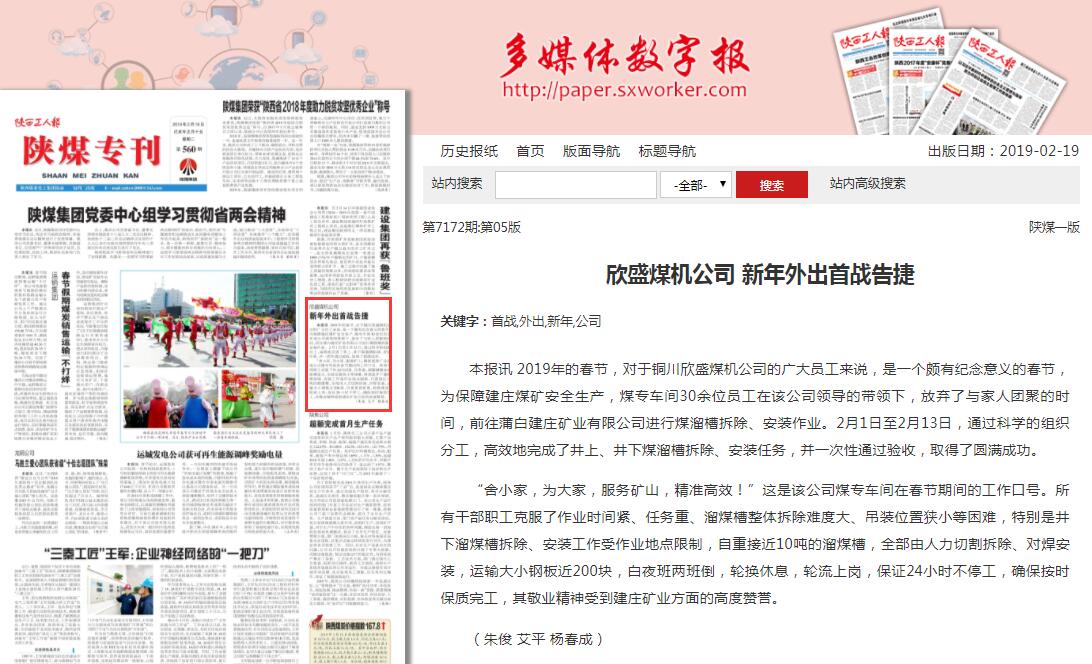 本報(bào)訊 2019年的春節(jié),對(duì)于銅川欣盛煤機(jī)公司的廣大員工來(lái)說(shuō),是一個(gè)頗有紀(jì)念意義的春節(jié),為保障建莊煤礦安全生產(chǎn),煤專(zhuān)車(chē)間30余位員工在該公司領(lǐng)導(dǎo)的帶領(lǐng)下,放棄了與家人團(tuán)聚的時(shí)間,前往蒲白建莊礦業(yè)有限公司進(jìn)行煤溜槽拆除、安裝作業(yè)。2月1日至2月13日,通過(guò)科學(xué)的組織分工,高效地完成了井上、井下煤溜槽拆除、安裝任務(wù),并一次性通過(guò)驗(yàn)收,取得了圓滿(mǎn)成功。