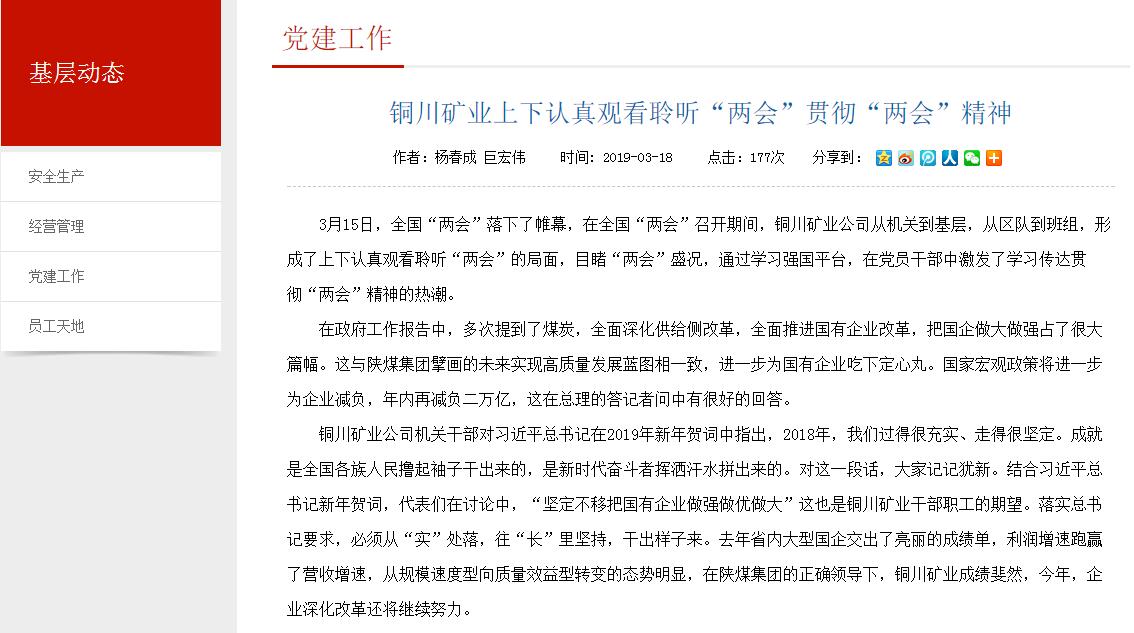 3月15日,全國(guó)“兩會(huì)”落下了帷幕,在全國(guó)“兩會(huì)”召開(kāi)期間,銅川礦業(yè)公司從機(jī)關(guān)到基層,從區(qū)隊(duì)到班組,形成了上下認(rèn)真觀看聆聽(tīng)“兩會(huì)”的局面,目睹“兩會(huì)”盛況,通過(guò)學(xué)習(xí)強(qiáng)國(guó)平臺(tái),在黨員干部中激發(fā)了學(xué)習(xí)傳達(dá)貫徹“兩會(huì)”精神的熱潮。