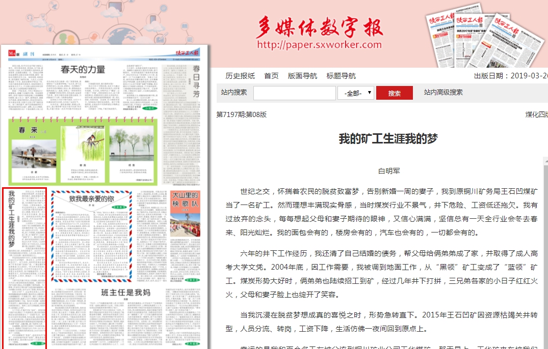 六年的井下工作經(jīng)歷,我還清了自己結(jié)婚的債務(wù),幫父母給倆弟弟成了家,并取得了成人高考大學(xué)文憑。2004年底,因工作需要,我被調(diào)到地面工作,從“黑領(lǐng)”礦工變成了“藍領(lǐng)”礦工。煤炭形勢大好時,倆弟弟也陸續(xù)招工到礦,經(jīng)過幾年井下打拼,三兄弟各家的小日子紅紅火火,父母和妻子臉上也綻開了笑容。