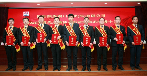 趙龍喜等18名同志獲被授予銅川礦業(yè)公司2017—2018年度勞動模范;玉華礦等8家單位被評為公司2018年度先進集體;陳家山礦等3家單位被評為公司2018年度追趕超越先進集體;鐵運分公司橫榆項目部等3家單位被評為公司2018年度走出去發(fā)展先進集體;安監(jiān)部等7個部室被評為公司2018年度先進部室;下石節(jié)礦運輸區(qū)機電班史卜文班等12個班組被評為公司2018年度十佳班組榮譽稱號。受到表彰的勞動模范、先進集體領(lǐng)取了獎牌和證書。