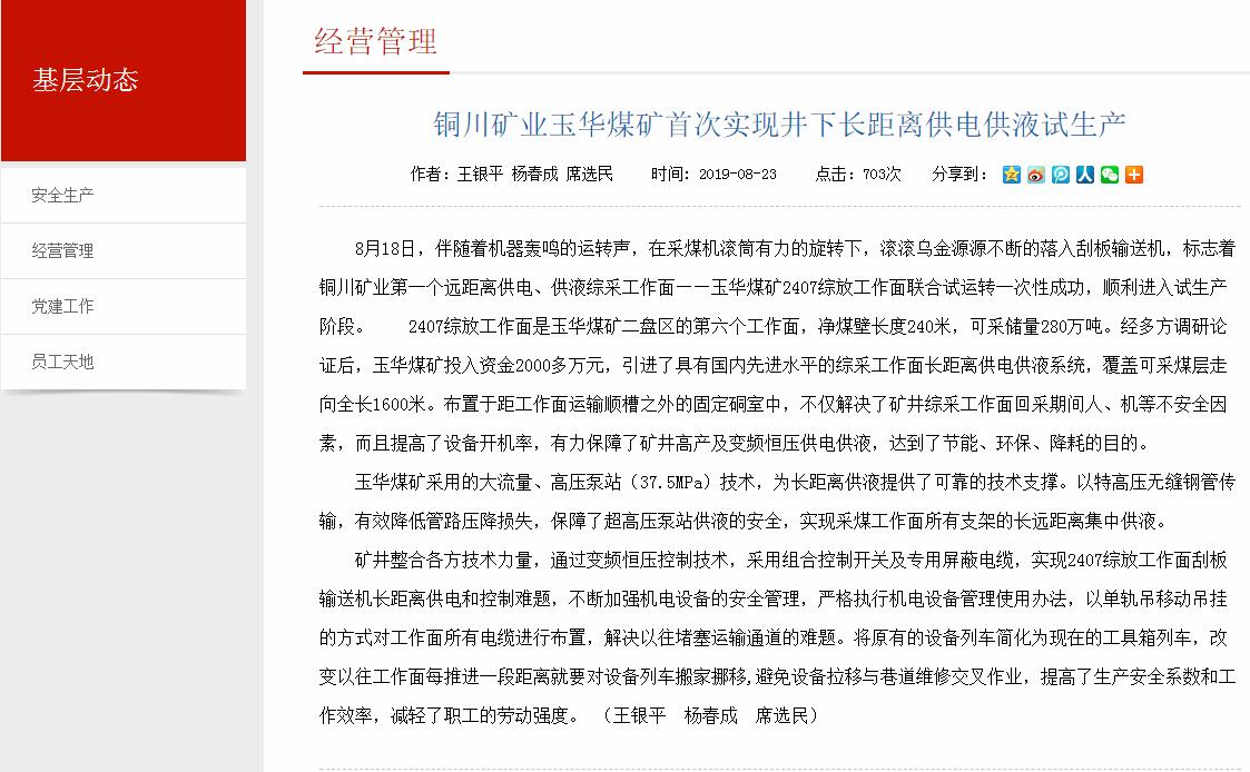 銅川礦業(yè)玉華煤礦首次實(shí)現(xiàn)井下長距離供電供液試生產(chǎn)