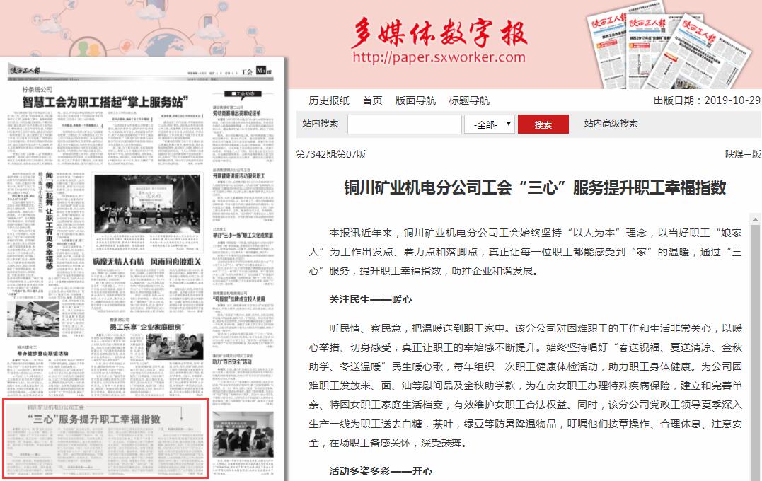 本報訊近年來,銅川礦業(yè)機電分公司工會始終堅持“以人為本”理念,以當好職工“娘家人”為工作出發(fā)點、著力點和落腳點,真正讓每一位職工都能感受到“家”的溫暖,通過“三心”服務,提升職工幸福指數(shù),助推企業(yè)和諧發(fā)展。